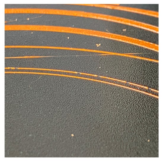 Grinding or stripping of filament refers to excessive shaving of plastics, causing the gear teeth to have little material to grab onto (Figure 7). The contributing factors include if the retraction setting is set too fast, the printing temperature is too low, the printing speed is too high, overtightened extruder, dirty extruder gears, jammed filament tubes, and/or a clogged nozzle. Solutions include the following: