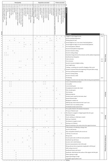This section discusses the most common problems encountered with the ME processes which have been categorized according to (3.1) printer-associated, (3.2) deposition-associated and (3.3) print quality issues (Table 7). This section also includes recommendations to overcome print failures and to improve print reliability. These results are derived using the Original Prusa i3 MK3 MR printer, Wanhao i3 duplicator and a Hage3D printer, as well as from existing literature [,,,,,,,]. The recommendations are not printer-specific and can be applied to most Cartesian based ME machines.