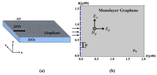 The monolayer graphene sheet lies on the substrate (plane XOZ) with a relative dielectric constant of , and is covered by a media with dielectric constant of , as schematically shown in Figure 1a.