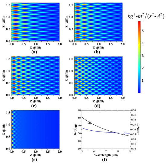 Figure 2 depicts the field distributions of the plasmonic Talbot patterns supported by the graphene monolayer, where the chemical potential is 0.3 eV, the period of the grating is 160 nm, the input wavelength in free space is 7 μm, 8 μm, 9 μm, 10 μm and 11 μm respectively and the effective wavelength in graphene is 64.3 nm, 86 nm, 111 nm, 137.9 nm and 168.2 nm respectively. All of the profile is obtained from COMSOL. The Talbot image arrays reproduce periodically along the propagation direction. In contrast to the conventional optical Talbot effect, the pattern of the plasmonic Talbot effect demonstrates the attenuation property, and eventually disappears at the propagation direction due to the propagation loss of graphene. However, from Figure 2a–e, it is clear that the Talbot image arrays disappear in different speeds with respect to the wavelength. Longer incident wavelength attenuates faster than the shorter ones. When incident, the wavelength is 11 μm and there is even no Talbot effect observable, as shown in Figure 2e. Figure 2f plots the imaginary part and real part effective index of the plasmon as a function of the wavelength with a given chemical potential. It is shown that the ratio of the imaginary part to the real part of the plasmon increases with the wavelength, which indicates that longer wavelength suffers higher attenuation. On the other hand, the effective wavelength increases linearly with the increase in . When is comparable to period D, the Talbot effect gradually fades away because the diffraction effect becomes weaker. Consequently, the higher order diffraction wave is suppressed by sub-wavelength grating. At this point, even if the wavelength continues to increase, the Talbot effect disappears, as shown in Figure 2e, where is 168.2 nm, which is comparable to the period D.