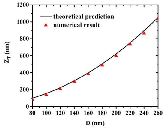Firstly, the Talbot effect distance is investigated as a function of the period D. The chemical potential of graphene is set as 0.3 eV, and the incident wavelength is fixed on 7000 nm, which means that is 64.3 nm. The period D starts at 80 nm and increases at a step of 20 nm and up to 260 nm. As demonstrated in Figure 3, grows with the period D in a parabolic way, which agrees well with Equation (9). Note that there are some small deviations between the numerical values and the predicted data obtained from Equation (9), which is due to the fact that the imaginary parts of the surface conductivity are ignored in the numerical calculation of Equations (3)–(9). Consequently, the analytical result of wavelength is slightly larger than the numerical results.