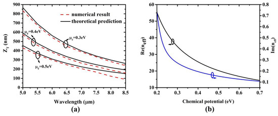 where is the temperature which is set as 300 K, is the electron momentum relaxation time, and which is set as 1 ps in this article. ħ is the reduced Planck constant. is the chemical potential, which could be modified by either chemical doping or the external gate voltage. The effective refractive index of graphene indicated as is described by Equation (7), where the real part of represents the dispersion characteristic and imaginary part implies the propagation loss of the plasmon. The effective wavelength can also be defined by Equation (8)
