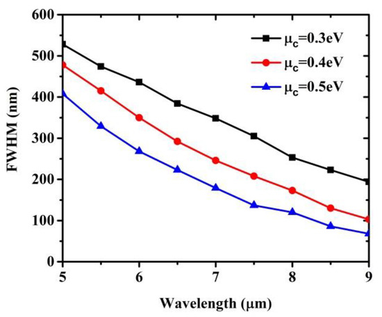 Finally, the full width at half maximum (FWHM) [32] of the Talbot image is also studied as a function of the incident wavelength as shown in Figure 5. Here, the period D is set as 160 nm and the duty cycle is 0.5. The optical field distribution behind the grating is the superposition of grating single slit diffraction and multislit interference. It can be seen from the simplest double-slit interference that the intensity of light waves at a certain point depends on the phase difference between the two interference waves, which can be described as Equations (10) and (11). So, the complex amplitude distribution of light field intensity is related to the spatial optical path difference and the phase difference introduced by the incident wave. Similarly, the FWHM also can be estimated by the phase difference between two points as shown in Equation (10). For a given chemical potential, the FWHM of Talbot image decreases with the increase in incident wavelength [33]. The larger the wavelength is, the more concentrated Talbot effect can be obtained, which improves the self-imaging resolution of sub-wavelength size. However, as a result the imaginary part of the effective refractive index of graphene represents the propagation loss; it should also be considered that a long wavelength possess greater material loss denoted by the ratio of the imaginary part to the real part of effective refractive index of graphene which can be observed visually from Figure 2f. Moreover, when the wavelength is fixed, the FWHM is inversely proportional to the chemical potential, as demonstrated in Figure 5. In the ranges of the chemical potential and wavelength, the FWHM is less than 1 μm, which implies the sub-wavelength imaging in the proposed structure. However, when the length of propagation of SPPs becomes smaller than the self-imaging distance, or the loss of plasmons is high enough, the phenomena are hard to obtain [34]. It should be noted that variation of the duty cycle of graphene grating has no effect on the FWHM. This may be understood by Equation (10), where no duty cycle is involved.