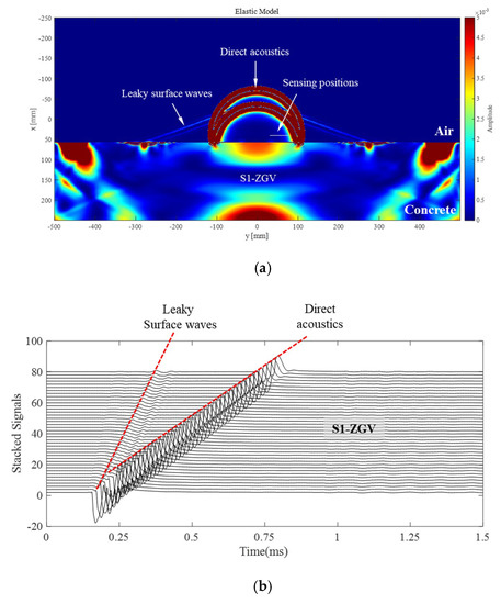 To confirm the theoretical background of the air-coupled IE method, wave propagation in the half-space was simulated using the k-wave toolbox in Matlab [20,21]. A half sine wave simulating a hammer-type impact was applied to the surface of concrete, and the corresponding stress wave field of air and concrete was solved. Forty sensors were continuously placed in air 20 mm above the surface of the concrete, 5 mm apart. The in-plane normal stress was analyzed as the output data. The details of the simulation are shown in Table 1. Figure 1a shows the wave field image of the air-coupled IE test, where the Von Mises stress is shown. From the image, the non-propagating S1-ZGV mode (thickness mode) was generated inside the concrete after the impact source was applied at the center of the concrete slab. In air, the leaky portion of the propagating waves (mainly Rayleigh waves) exhibited much greater velocity compared to the direct acoustics (semi-circle shape) generated by the impactor. Inside the semi-circle, the leaky portion of the thickness mode, measurable using air-coupled sensors, is shown. The signals obtained, as shown in Figure 1b, conveyed that the majority of frequencies were from the thickness mode vibration (S1-ZGV) while the propagating waves (including the leaky waves and direct acoustics) had a much higher amplitude, which were noise components of the air-coupled IE test. In fact, acoustic system noise has been reported during air-coupled sensing [11,12,16] so that efforts have been made to carefully measure the appropriate frequencies from the IE testing. Therefore, the impactor was required not to generate system noise itself while propagating leaky waves were quickly damped.