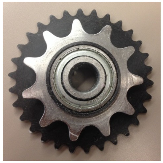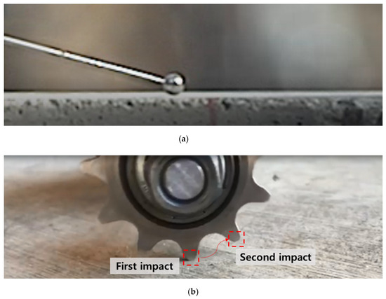 Photo of the contact mechanism: (a) 12 mm ball hammer, (b) 11-tooth gear.