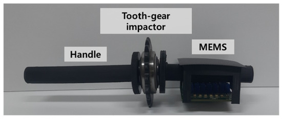 Based on the background information of the contact mechanism, a tooth gear IE system was designed as shown in Figure 4. For the receiver, a microelectromechanical system (MEMS, SPU0410LR5H-QB, Knowles) was used with a circuit amplified 2000 times, able to measure acoustic pressure with a sensitivity of −38 dBV/Pa. The location of the MEMS was in the same line as the impact source, 65 mm away from the tooth gear. The holder was manufactured using a three-dimensional (3-D) printer, and the system was manually controlled using a handle. The total length of the system was 200 mm so that inspectors could easily use the system in the field. While the system moves backwards and forwards, numerous signal data were measured. For data acquisition, the signals were digitized using the NI 6366, at a sampling rate of 200 kHz, and 2000 samples were collected. The total length of a signal was 10 ms. As shown in Figure 5, the testing equipment (including the laptop, data acquisition, and IE system) was placed on the concrete slab. Based on the test results, more than 100 data signals were recorded within one minute, while the system was moving.