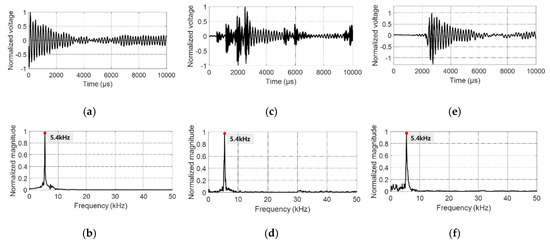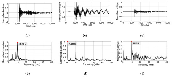Obtained signals from the deep delamination. Steel ball impactor (a) time signal and (b) frequency spectrum. 11-tooth gear (c) time signal and (d) frequency spectrum. 30-tooth gear (e) time signal and (f) frequency spectrum.