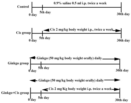 Ginkgo+Cis group: Rats received Ginkgo (50 mg/kg body weight PO) daily 30 days [38]. On the 5th day, rats were injected with Cis 2 mg/Kg body weight IP twice a week for 30 days [36].
