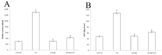 The activities of cholinesterase (Figure 2A) and GGT (Figure 2B) were significantly (p < 0.05) increased in the Cis group in comparison with the control group. Administration of Ginkgo with Cis in Ginkgo+Cis group decreased the activities of CHE and GGT compared to Cis only in Cis group at (p < 0.05).