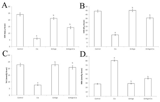 Cis administration caused a significant decrease of GSH concentration (Figure 3A), SOD activity (Figure 3B), TAC concentration (Figure 3C) and a significant increase of MDA concentration (Figure 3D) in comparison with the control group (p < 0.05). Administration of Ginkgo with Cis reversed the adverse effect of Cis as Ginkgo+Cis group indicated a significant boost of GSH concentration, SOD activity, TAC concentration and a significant reduction of MDA in comparison with the Cis group (p < 0.05).