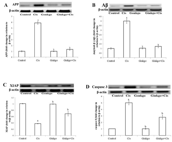 The changes of amyloid precursor protein (APP), Aβ, XIAP and caspase-3 in different groups. The effect of Cis, Ginkgo, and their combination on the expression levels of APP (A), Amyloid β (Aβ) (B), XIAP (C), caspase-3 (D) in rat brain tissues. Data present as mean ± SE (n = 10). a indicates a significant difference compared to control group, b indicates a significant change compared to Cis group. a and b indicate statistical significance at p < 0.05 using ANOVA followed by Tukey–Kramer as a post ANOVA test.