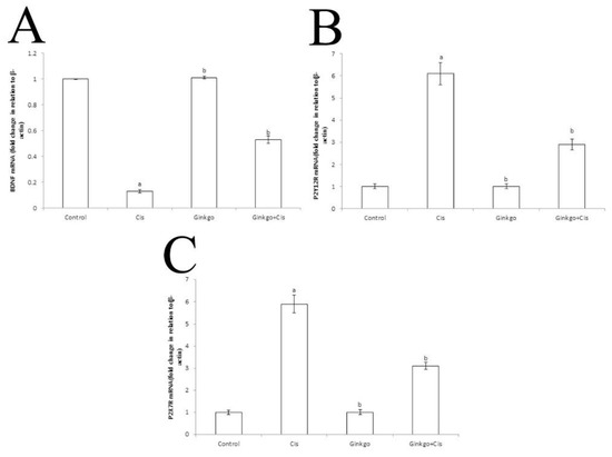 The changes of BDNF, P2Y12R and P2X7R mRNA expressions in different group. The Effect of Cis, Ginkgo, and their combination on the expression levels of BDNF (A), PY12R (B) and P2X7R (C) in rat brain tissues. Data were presented as mean ± SE (n = 10). a indicates a significant difference compared to control group, b indicates a significant change compared to Cis group. a and b indicate statistical significance at p < 0.05 using ANOVA followed by Tukey–Kramer as a post ANOVA test.