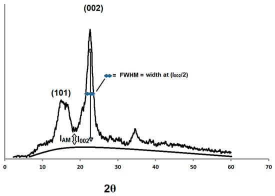 The XRPD spectra of the compacted and non-compacted Avicel PH-101 powders were compared with ball milled Avicel PH-101as a reference. It is evident that the ball milled Avicel PH-101 yielded a clear amorphous pattern (Figure 1). The relative amount of crystallinity in cellulose samples was estimated using a method described by Segal and coworkers [] to calculate the crystallinity index (CrI). CrI was calculated from the ratio of the height of the 002 peak (I002) and the height of the minimum (IAM) between the 002 and the 101 peaks illustrated in a demonstrative sketch in Figure 1. However, when the difference between CrI values is relatively insignificant, particularly for samples of a broad diffraction spectrum, the full-width at half-maximum (FWHM) is expected to provide a reasonable (indication) estimate of crystallinity.