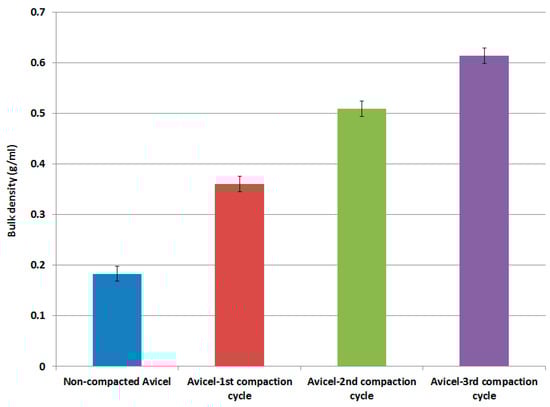 Results of the bulk density of non-compacted Avicel PH-101 and compacted Avicel PH-101 (1st, 2nd, and 3rd compaction cycles) are presented in Figure 2. Generally, the bulk density of MCC is low compared to other common DC excipients [,]. In this work, Figure 2 indicates that high-pressure roller compaction of Avicel PH-101 can increase its bulk density from 0.18 g/mL up to a value of about 0.61 g/mL which is ideal for compression machines [,].