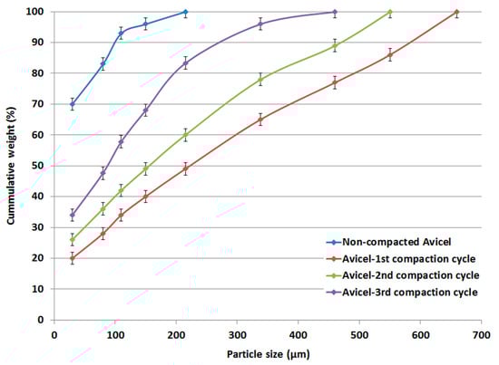 The particle size distributions of Avicel PH-101 showed a typical narrow range. Interestingly, the data in Figure 3 further show a broader distribution when Avicel PH-101 was subjected to the 1st, 2nd, and 3rd compaction cycles using roller compaction. However, a higher number of compaction cycles causes the particle size to decrease.