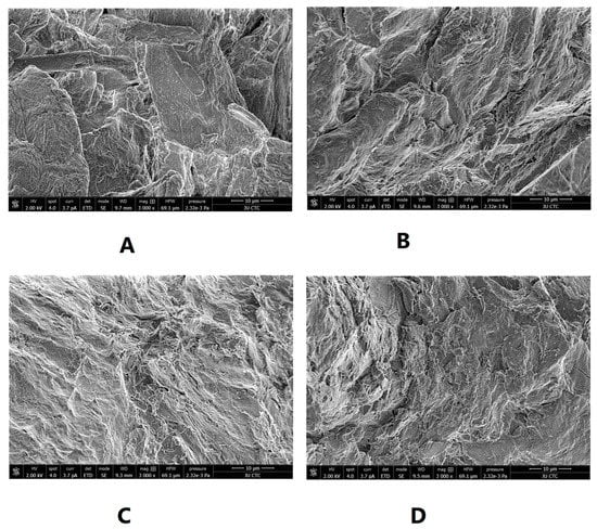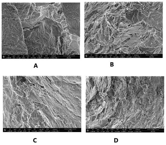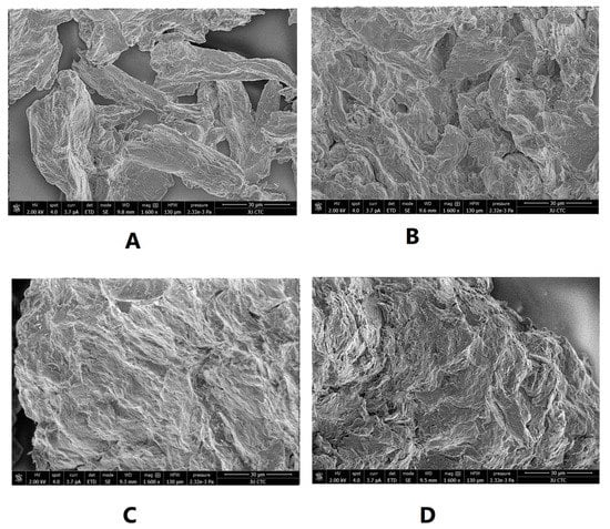 SEM was used to illustrate the effect of intensified compaction on micro-irregularities in Avicel PH101 powder surface. The data in Figure 4, Figure 5 and Figure 6 presents the SEM of non-compacted Avicel PH-101 (A), roller compacted Avicel-1st compaction cycle (B), roller compacted Avicel-2nd compaction cycle (C), and roller compacted Avicel-3rd compaction cycle (D) at magnifications of 1600×, 3000×, and 6000×. The resulting images indicate how the surface of MCC is transformed from irregular layered lumps into smoother and more fused surfaces. Some kind of irregularities appears on powder compacts under the third compaction cycle. This is due to deformation under this intensified compaction which appears at magnification of 6000×. Such magnification, unfortunately, does not allow us to allocate single NCF rods. It is evident from these images that roller compaction converted the fibrous, multi-layered granules into fused smoother surfaces which appeared in the 2nd compaction cycle. The long fibers became shorter on intensification of compaction. This facilitates binding of Avicel granules into a fused surface and appears after the third compaction cycle.