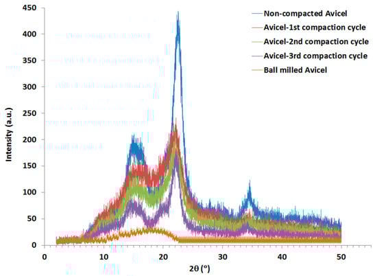 Raw (un-compacted) Avicel®® PH-101, Avicel®® PH-101 subjected to 1st, 2nd, and 3rd compaction cycles were tested using an X-ray powder diffractometer (Bruker, Karlsruhe, Germany) in 2θ reflection mode and a range of 2–40°. The X-ray compartment used consisted of a D2 Phaser in a ceramic sealed X-ray tube with Cr, Co, Cu radiation operating at 30 kV/10 mA. DIFFRAC.SUITE™ computer software was used to measure and analyze the data.