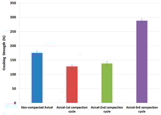 All tested powders were compressed using a single punch tablet machine; the crushing force of all the tablets produced is presented in the data in Figure 8. Compacts produced from granules resulting from the 1st high-pressure compaction cycle of the roller compactor were weaker than those of the original non-compacted powder. The crushing force started to increase for the granules resulting from the 2nd high-pressure compaction cycle. However, the tablet hardness was still lower than that of un-compacted powder. Surprisingly, the granules of the 3rd compaction cycle resulted in tablets with a crushing force much higher than that of the original non-compacted powder.