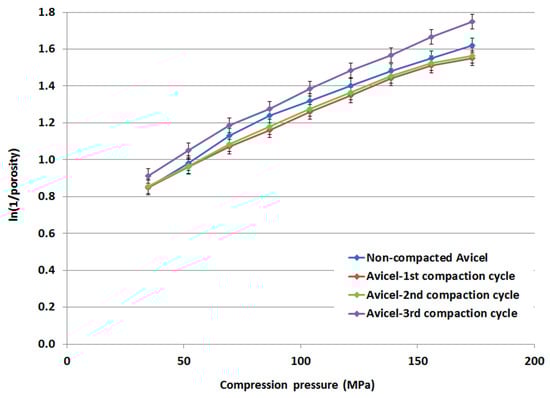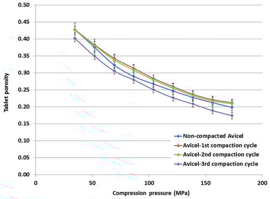 The tablet porosity, determined from its thickness, is presented for the compacts made from non-compacted Avicel PH-101, compacted-1st cycle Avicel PH-101, compacted-2nd cycle Avicel PH-101, and compacted-3rd cycle Avicel PH-101 (Figure 9). The porosity of tablets made of compacted powder representing the 1st and 2nd compaction cycles is higher than that of tablets made of non-compacted powder. However, tablet porosity was found to decrease to values lower than that for the non-compacted powder when the powder representing the 3rd compaction cycle was compressed.