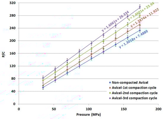 From the graphical presentation of P/C versus P, the constants can be evaluated. The constant “a”, is the reciprocal of the slope from the linear portion of the plot and represents the compressibility index, which is related to the total volume reduction for the powder bed; 1/ab is the intercept used to calculate the constant “b” which is termed the coefficient of compression and relates the resistant forces (friction/cohesion) to compression []. Moreover, the product of ab has been reported to represent the extent of particle rearrangement under compression pressure [].