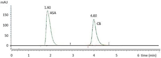 The limits of detection and quantification were 0.0004 and 0.0012 mg/mL for ASA, and 0.0002 and 0.0007 mg/mL for CB, respectively.