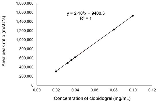 Linearity was evident in the concentration range 0.0275–0.1375 mg/mL for acetylsalicylic acid and 0.0200–0.1000 mg/mL for clopidogrel bisulfate with a correlation co-efficient (R2 value) of 0.9999 (Table 1, Figure 4 and Figure 5).