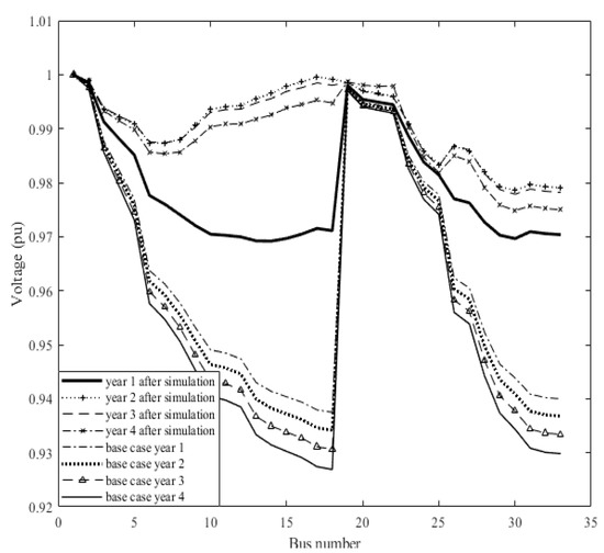 Figure 4 represents the average network voltage before (without DG) and after (with DG) simulation. According to Figure 4, the voltage improvement rate could be clearly seen. As shown in the diagram, the base year of the program is also below the rated voltage (0.95) and, in order to improve the network voltage in the first year, it is necessary to add the DGs to the network. The voltage in the fourth year, due to the annual increase in load, gets the worst value, with an average of less than 0.93. Nevertheless, at the end of the planning, the network would no longer have this problem and therefore the voltage would increase significantly.