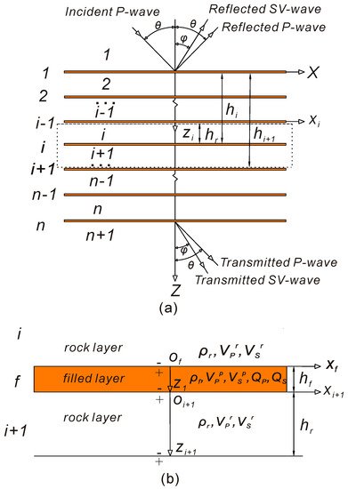 where kxi, kzpi are the P-wave numbers of the ith layer in the x and z directions, and kzsi is the S-wave number of the ith layer in the z direction. As shown in Figure 1b, the sandwiched element consists of two types of materials in turn. When the wave propagates in the rock layer, the wave numbers kxi, kzpi and kzsi can be expressed as kxr = kpr sin θ, kzpr = kpr cos θ, , where kpr = ω/Vpr is the wave number of the P wave. Similarly, when the wave propagates in the filled layer, the wave numbers kxi, kzpi and kzsi can be expressed as kxf = kpf sin θ, kzpf = kpf cos θ and , where kpf = ω/Vpf is the wave number of the P-wave propagation through the filled medium.
