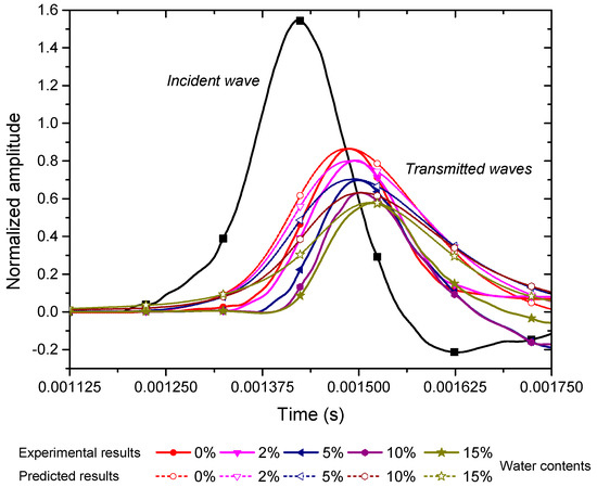In this section, the analytical model is calibrated according to the experimental data from [12]. In their study, a layer of quartz sand with a fixed thickness of 2 mm but varied water content of 0%, 2%, 5%, 10%, and 15% (saturated) was sandwiched between two norite bars to simulate filled joints with different water contents. The stress wave was induced by a split Hopkinson rock bar (SHRB) system. The quartz sand had a porosity of around 0.4 and material density of 2620 kg∙m−3 (solid density). The density of fillings with different water contents can be calculated and listed in Table 1. The norite had a P-wave velocity of 6000 m∙s−1 and density of 2900 kg∙m−3 [12,42]. The S-wave velocity of the norite was taken as 2/3 of its P-wave velocity (4000 m∙s−1). The experimental incident wave was adopted as the incident wave to predict transmitted waves after propagating through filled joints with different water contents. The start time of the wave signal to oscillate has a delay of around 0.0012 s compared with that in [12]. Table 1 shows the calibrated parameters in cases of different water contents. Except the density of the filled medium, other parameters all decrease with increasing water content. According to Section 2, the decrease in the quality factor indicates the increase in the viscosity of the filled joint.