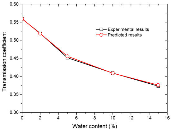 Variation of the transmission coefficient versus the water content by experiments (reproduced with permission from [12], Springer Wien, 2015) and predicted by our analytical model.