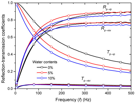 Figure 6 shows the reflection –transmission coefficients varying with wave frequency f. We can see that Tp→p decreases basically in a negative exponential form with increasing f. Rp→p and Rp→sv first increase abruptly with increasing f, then they only have slight changes. Compared with the other three types of coefficients, Tp→sv is relatively insensitive to f. Cases of different water contents present similar variation of reflection–transmission coefficients versus f except for the magnitude difference. As the water content increases, Tp→p decreases evenly and corresponding curves become divergent; Both Rp→p and Rp→sv generally have an increasing trend of which the variation is smaller than that of Tp→p; Tp→sv curves for different water contents basically overlap with each other which indicates that it is independent of the water content of the filled medium.