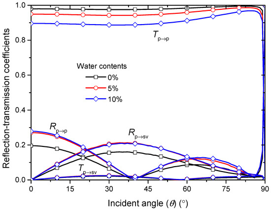 Figure 7 shows the reflection–transmission coefficients versus the incident angle θ when a P wave obliquely impinges on a single filled joint considering the different water contents. It shows that Tp→p does not change much with increasing θ until θ approaches the critical angle 90°, and it suddenly decreases to 0. When θ is smaller than around 40°, Rp→p first decreases with increasing θ. As θ is larger than around 40°, it gradually increases to a peak and then it deceases instead. When θ is larger than around 83°, Rp→p increases rapidly. Tp→sv changes gently with the increase in θ. Rp→sv first increases to the maximum value at θ of approximately 40° and then it decreases with increasing θ instead. Generally, Tp→sv is much smaller than Tp→p. As the water content increases, Tp→p decreases evenly and related curves become divergent when θ is smaller than 83°; When the water content increases from 0% to 5%, both Rp→p and Rp→sv have an obvious increase while they have very limited changes as the water content increases from 5% to 10%; Tp→sv is basically independent on the water content of the filled medium.