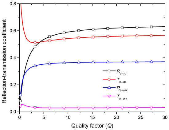 Figure 8 shows the reflection –transmission coefficients versus the quality factor when a P wave impinges on a single filled joint with a thickness of 40 mm. For convenience, a variable Q is introduced to express Qp and Qs as Qp = Q and Qs = 2/3Q, respectively. To only investigate the influence of the quality factor of the filled medium, the density, thickness and wave velocity of the filled medium were fixed as constant values (Vpp = 185 m∙s−1, Vsp = 123 m∙s−1 and ρf = 1807 kg∙m−3). It shows that Tp→p decreases abruptly with Q increasing, after achieving a minimum value, it increases with an increment of Q instead and eventually it basically keeps invariant. Tp→sv does not change much with increasing Q. Both Rp→p and Rp→sv increase rapidly with Q increasing and then they increase gently, and they basically keep invariant as Q is larger than 20. Generally, Q has a more significant effect on Tp→p, Rp→p and Rp→sv than Tp→sv.