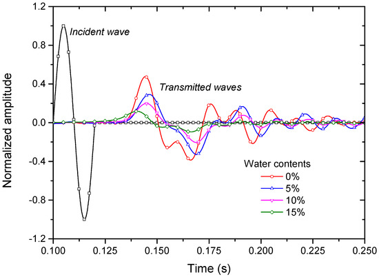 Figure 10 shows transmitted waveforms (P-wave component) after a P wave obliquely propagates through four parallel filled joints with an identical filled thickness hf of 40 mm and joint spacing hr of 50 m, considering different water contents. It displays that each transmitted wave is made up of several cycles of waveforms arriving at different times induced by multiple reflections at joints. We can clearly see the wave superposition presenting multiple peaks and valleys in turn. As the water content increases, the transmitted wave decreases in the amplitude and the component of the later-arriving wave gradually fades away. When the water content is 15%, it is difficult to observe the later-arriving transmitted wave (after 0.18 s).