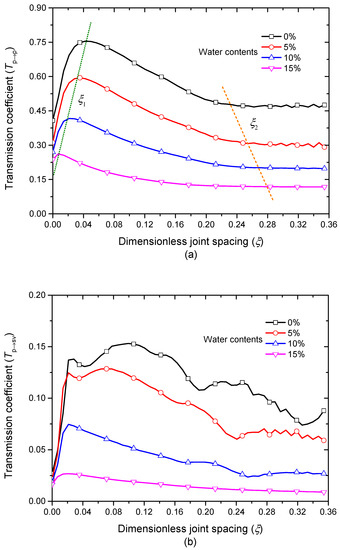 Figure 11 shows that variation of transmission coefficients Tp→p and Tp→sv versus ξ after the P wave obliquely propagates through four parallel joints considering different water contents. It shows that there exists two threshold lines ξ1 and ξ2 dividing each curve into three parts, which is similar to results in published papers [21,33,34,35,44]. Tp→p first decreases with increasing ξ (ξ < ξ1) and then it decreases instead (ξ1 < ξ < ξ2) and at last it basically keeps invariant (ξ > ξ2). With the water content increasing, Tp→p decreases and the position for the first threshold point moves to the left while the second one moves to the right. The increasing part of the curve (ξ < ξ1) shortens while the decreasing part (ξ1 < ξ< ξ2) widens. Tp→sv first increases with increasing ξ, then it decreases after achieving a peak in general. When the water content is low, there exist fluctuations on the curve. As the water content becomes higher, these fluctuations gradually fade away and the curve becomes more and more flat. From Figure 10 and Figure 11, it indicates that the effects of multiple reflections at joints on the transmitted wave and transmission coefficient were significantly reduced when the water content increased.
