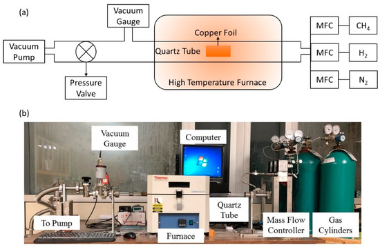 Figure 1 shows the low preassure chemical vapor deposition (LPCVD) system for graphene synthesis. The mass flow controller (MFC) controls the quantity of gas that flows into the quartz tube for reaction. A 125 µm thick copper foil (99.9%, Alfa Aesar 13380, Alfa Aesar, Ward Hill, United States) was pretreated in acetic acid (99.7%, Sigma Aldrich 695092, Sigma Aldrich, St Louis, United States) for 48 h and then cleaned with DI water, IPA and acetone. Monolayer graphene was synthesized on the copper foil in the reaction chamber (quartz tube) with 5 sccm (standard cubic centimeter per minute) hydrogen flow for 30 min and then 5 sccm methane flow for 10 min under 1030 °C at ~100 mTorr vacuum pressure. The as-grown graphene on copper was then cooled down to room temperature for next step usage.