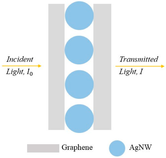 As shown in Figure 3, a three-layer thin film model is introduced to characterize the optical transmittance of the composite. The wavelength of the light source is 550 nm, which is far greater than the AgNW diameter (~30 nm). Therefore, the diffraction effect on AgNW and interference between two graphene layers are neglected. The total optical transmittance T can be expressed as follows: