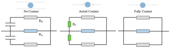 Sheet resistance of the composite RS is determined by three components: sheet resistance of the graphene layer RG and AgNW network RA, and contact resistance RC between the first two components. As shown in Figure 5, three types of contact conditions and corresponding circuit models are defined based on the contact condition. The fully contact model is an assumed ideal condition in which the AgNW-to-graphene and graphene-to-graphene are in perfect adhesion with no contact resistance. The no contact model is another assumed condition in which AgNW and graphene layers have no contact with each other. These two assumptions are set to capture the upper and lower bond of the actual sheet resistance of the nanocomposite, which is described by the actual contact model. Sheet resistances of these three conditions can be expressed as follows: