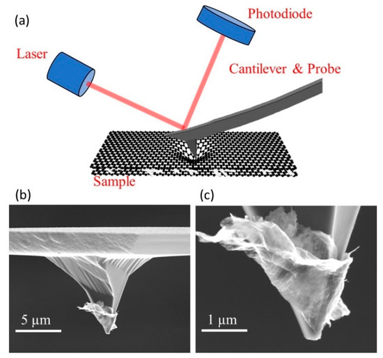 The stiffness of the nanocomposite was characterized by the atomic force microscope (AFM) indentation. As shown in Figure 6a, the AFM consists of a cantilever probe, photo diode, and laser. The laser and diode are used to measure the displacement of the probe. The cantilever probe is designed to measure the force. Figure 6b,c shows the probe tip after indentation, which has the residual graphene and nanocomposite on it.