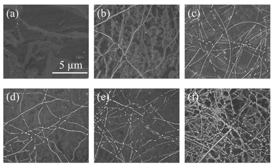 SEM images of (a) two-layer graphene; (b–f): Gr/AgNW/Gr composite with AgNW concentration of 0.2, 0.4, 0.6, 0.8, and 1.0 mg/mL.