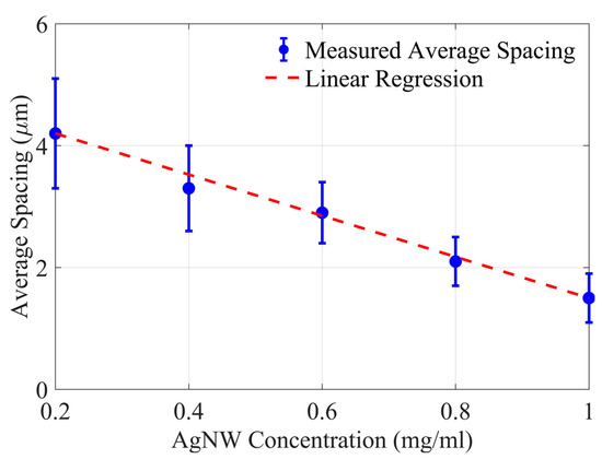 Figure 7 shows the optical microscope images of the two-layer graphene and the Gr/AgNW/Gr nanocomposite (higher illumination to emphasize the AgNW). Some ruptured holes can be observed on the grid owing to the synthesis process. Figure 8 shows the SEM images of two-layer graphene and Gr/AgNW/Gr composites with different AgNW concentrations. As the nanowire is randomly distributed between two graphene layers, average AgNW spacing is first characterized. Multiple measurements of the AgNW spacing were conducted and averaged to obtain the average spacing value. As shown in Figure 9, the average spacing decreases linearly from 4.2 µm to 1.5 µm with the increased AgNW concentrations.