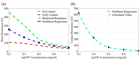 On the basis of Equation (3) and the measured sheet resistance of the composite, contact resistances with different AgNW concentrations can be derived and are shown in Figure 10b. Nonlinear regression of the sheet resistance RS and contact resistance RC is conducted and the correlation functions with various AgNW concentrations ϕ are obtained as follows: