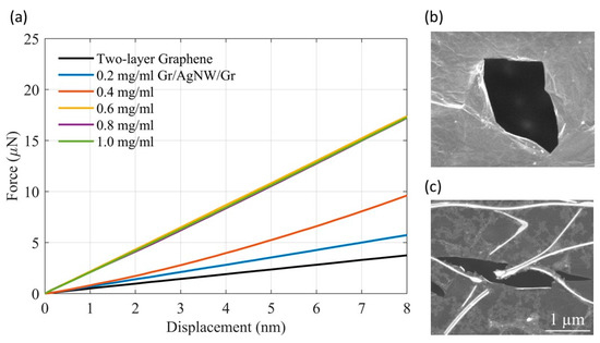 Table 3 and Figure 11a show the stiffness values and the force–displacement curves of the AFM indentation on the free-stand two-layer graphene and Gr/AgNW/Gr composites. Figure 11b,c shows the SEM images of the two-layer graphene and the Gr/AgNW/Gr nanocomposite after the AFM indentation. The cut-wire phenomenon observed on the nanocomposite indicates the strengthening effect of the AgNW on increasing the mechanical property of the nanocomposite. Compared with two-layer graphene, the stiffness of the composite increases with higher AgNW concentrations, while it becomes stable after 0.6 mg/mL with the value of around 2150 N/m, which indicates the maximum stiffness enhancement by the AgNW network reaches 0.6 mg/mL. This is owing to the limited interfacial bonding strength between the graphene layer and the AgNW network. When the AgNW concentration is higher than 0.6 mg/mL, the interfacial bonding between the Gr and AgNW dominates the stiffness of the nanocomposite. Therefore, the continuously increased AgNW concentration after 0.6 mg/mL cannot enhance the mechanical strength of the nanocomposite.