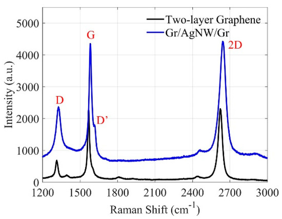 Raman spectra of two-layer graphene and the Gr/AgNW/Gr composite.