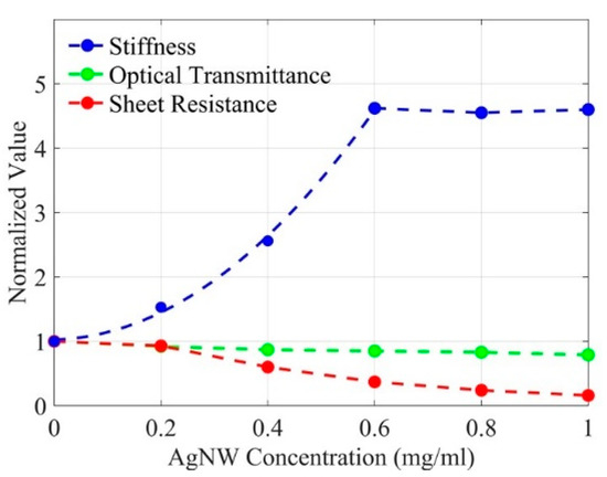 To summarize the results more clearly, the optical transmittance, sheet resistance, and stiffness values are normalized with the value of two-layer graphene set to 1. Figure 13 and Table 5 show the normalized values of the optical transmittance, sheet resistance, and stiffness, respectively. From 0.2 to 1.0 mg/mL of AgNW concentration increasing, the optical transmittance and sheet resistance reduce to 79% and 16% of the original two-layer graphene value, respectively. The stiffness of the composite increases at first and then becomes stable after 0.6 mg/mL with a value of approximately 4.6 times higher than two-layer graphene.