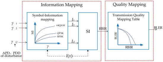 Therefore, a dynamic quality model is proposed to achieve the MI-based CQI of transmission under time-varying disturbances, as illustrated in Figure 3. Firstly, the performance metric of every single code block is obtained by information mapping, based on the statistical characteristics of EMI. It is important to note that the APD and PDD of disturbance n(t) should be measured using the equivalent bandwidth of the railway wireless service to be monitored [17]. According to MI-ESM algorithm, a received bit information rate (RBIR) is defined as the CQI to indicate the transmission quality. Then, a novel metric, long-term effective RBIR (RBIRL), is put forward to reflect the general transmission performance in the presence of the dynamic disturbance. To combine the RBIR of each block in time-varying situations, RBIRL is achieved by the weighted sum of the RBIR series. Therefore, the RBIRL is the equivalent CQI of RBIR in a stable channel. Since RBIRL can be mapped to the average BLER (BLERave) through the look-up table under the AWGN channel, the quality of the radio transmission is thus evaluated by the RBIRL value.