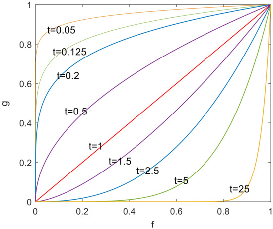 The function g is illustrated in Figure 5. As is shown, in the case of t = 1, β is in proportion to fR2B(RBIR), just referring to the linear relation. As for t > 1, the data block with the worse error performance has a higher weight, and vice versa. In fact, t is mainly dependent on the function fR2B(RBIR) other than the value of RBIR [35].