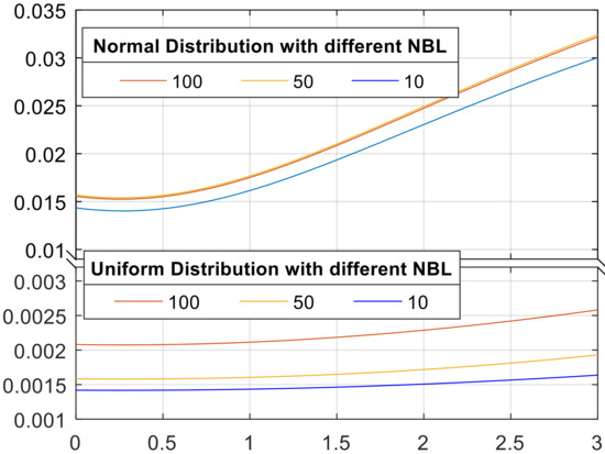 Assuming that fR2B(x) = 0.5erfc(x), Figure 6 shows the value of the BLER MSE as the variation of t, when {RBIRi} obey different distributions. It indicates that t = 0.26–0.28 when the squared error reaches the minimum, irrelevant with the number of blocks. Therefore, we specify t = 0.27 and the approving result is achieved.