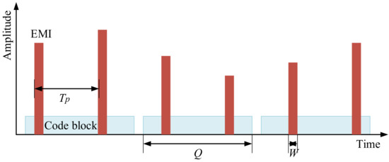 Illustration of the case that the repeated cycle Tp is nearly equal to the length of the code block Q. EMI: electromagnetic interference.