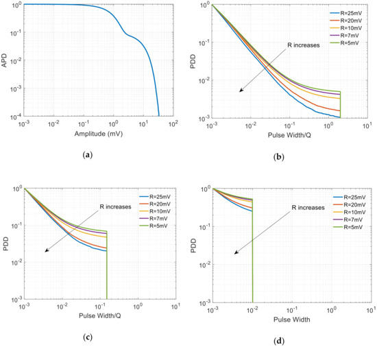 APD and PDD plots of the pulsed disturbances shown in Figure 11: (a) the same APD of all disturbances; (b) the PDD when Tp = 20Q, ρ = 0.1; (c) the PDD when Tp = 1.5Q, ρ = 0.1; and (d) the PDD when Tp = 0.1Q, ρ = 0.1.